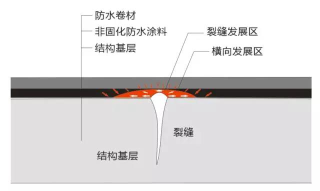 非固化復(fù)合防水層能很好地封閉基層的毛細(xì)孔洞和微細(xì)裂縫, 使基層具有一定的防水能力,當(dāng)基層開(kāi)裂拉伸防水層時(shí), 由蠕變性防水材料形成的構(gòu)造層次吸收了來(lái)自基層的應(yīng)力,使應(yīng)力不會(huì)傳遞給防水層,提高了防水層的可靠性并延長(zhǎng)了防水層壽命。
