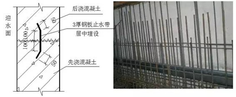 鋼板的凹面應(yīng)朝向迎水面,轉(zhuǎn)角處止水鋼板應(yīng)做成45°角。止水鋼板居中布置。橡膠止水帶及鋼板橡膠止水帶做法同上。