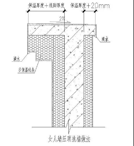 ①墻體頂部與外保溫交接位置必須加設(shè)混凝土挑檐。
